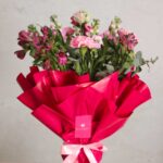 “Barbie’s Favourite Bouquet” captures the playful and bold spirit of its namesake with its rich pink blossoms, cradled in contrasting fuchsia wrapping, tied with a delicate ribbon, evoking a sense of whimsical charm and youthful delight.