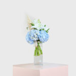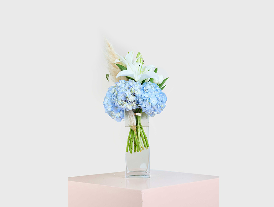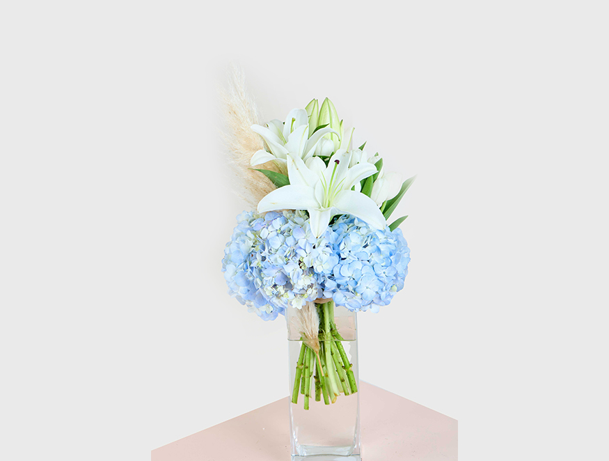 Experience tranquility with the Blue Serenity bouquet, showcasing elegant white lilies and soft blue hydrangeas. Enhanced by pampas grass, this arrangement balances elegance and natural beauty.