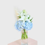 Embrace tranquility with the Blue Serenity bouquet, a stunning combination of serene white lilies and soft blue hydrangeas. The lush white blooms radiate purity and grace, while the light blue hydrangeas bring a refreshing, calming presence. Accentuated by natural pampas grass, this arrangement creates an ethereal balance of elegance and natural beauty.