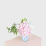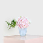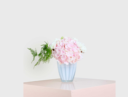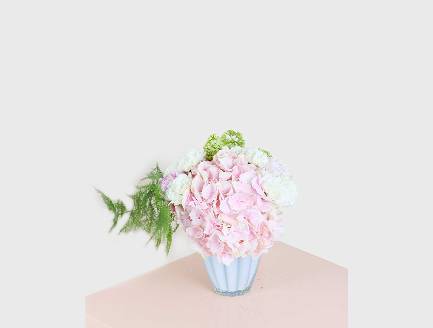 The Blush Hydrangea Delight arrangement features pastel pink hydrangeas and creamy white carnations, creating a soft and captivating blend perfect for romantic gestures or thoughtful gifts. Housed in a chic scalloped vase, this elegant bouquet adds freshness and joy to any setting.