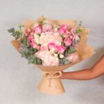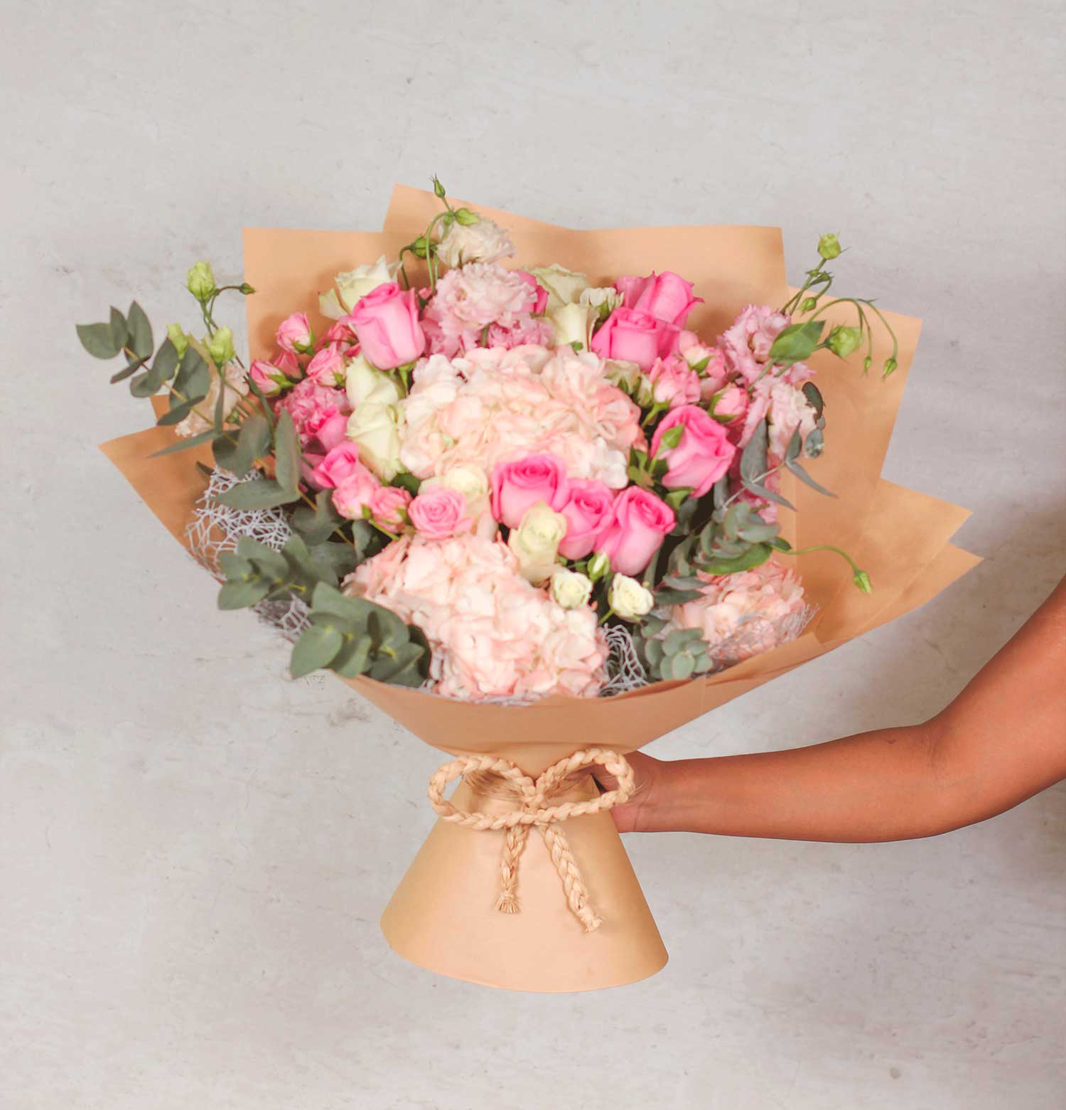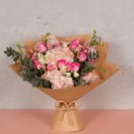 The Chic Blooms Bundle Bouquet is an exquisite collection of pastel pink roses and lush hydrangeas, wrapped in a natural kraft paper with a jute bow. It exudes rustic elegance and is ideal for sophisticated gifting or as a charming centerpiece for your home.