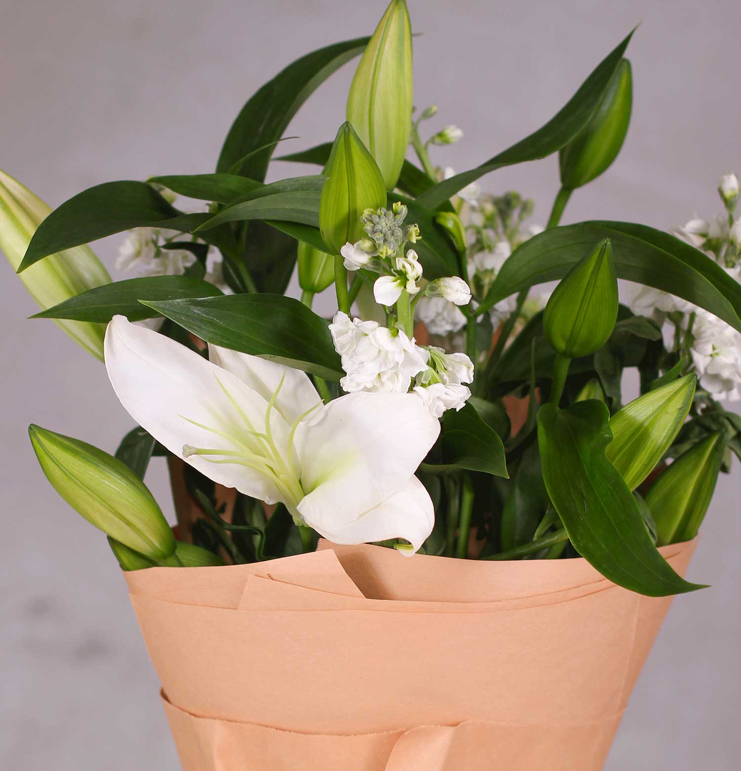 “Daily Dose Flower Lily” offers a refreshing touch of simplicity with its elegant white lilies and greenery, tastefully presented in a natural brown paper wrap, ideal for daily moments of appreciation or serenity.