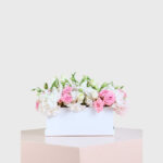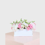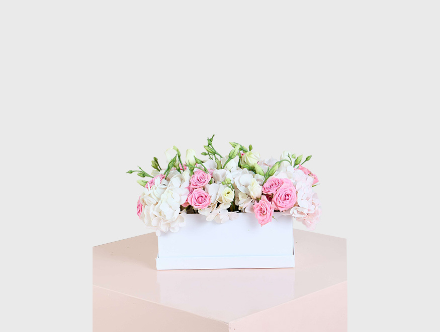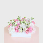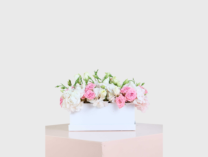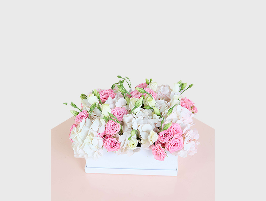 A delicate combination of soft pink roses, white hydrangeas, and lisianthus, arranged elegantly in a sleek white box. This romantic arrangement exudes charm and grace, making it the perfect gift for anniversaries, weddings, or any occasion that calls for a touch of sweetness and sophistication.