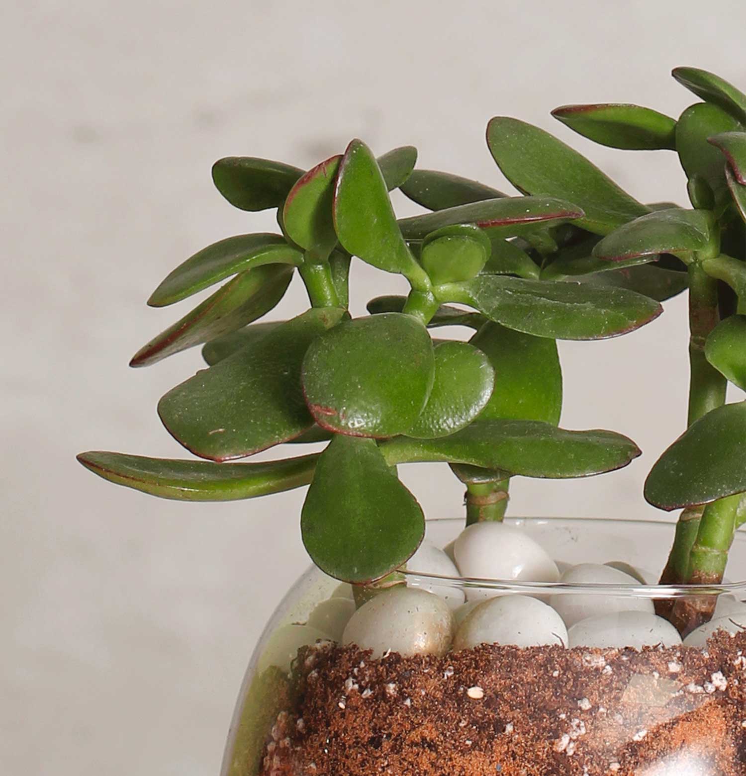 "Grounded - Plant Arrangement" This jade plant arrangement in a rounded glass vase with earthy accents offers a grounding presence to any space. Its resilience and effortless elegance make it a symbol of stability and longevity, fitting for both personal and professional settings.