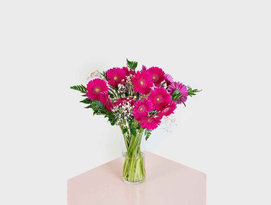 Bold and vibrant, this striking bouquet of bright pink Gerberas is a celebration of joy and passion. Paired with fine sprigs of Baby’s Breath and lush greenery, this arrangement exudes energy and liveliness. Whether you're looking to make a statement or bring a pop of color to any room, this arrangement is sure to leave a lasting impression. Perfect for congratulatory occasions or simply to spread happiness.