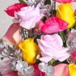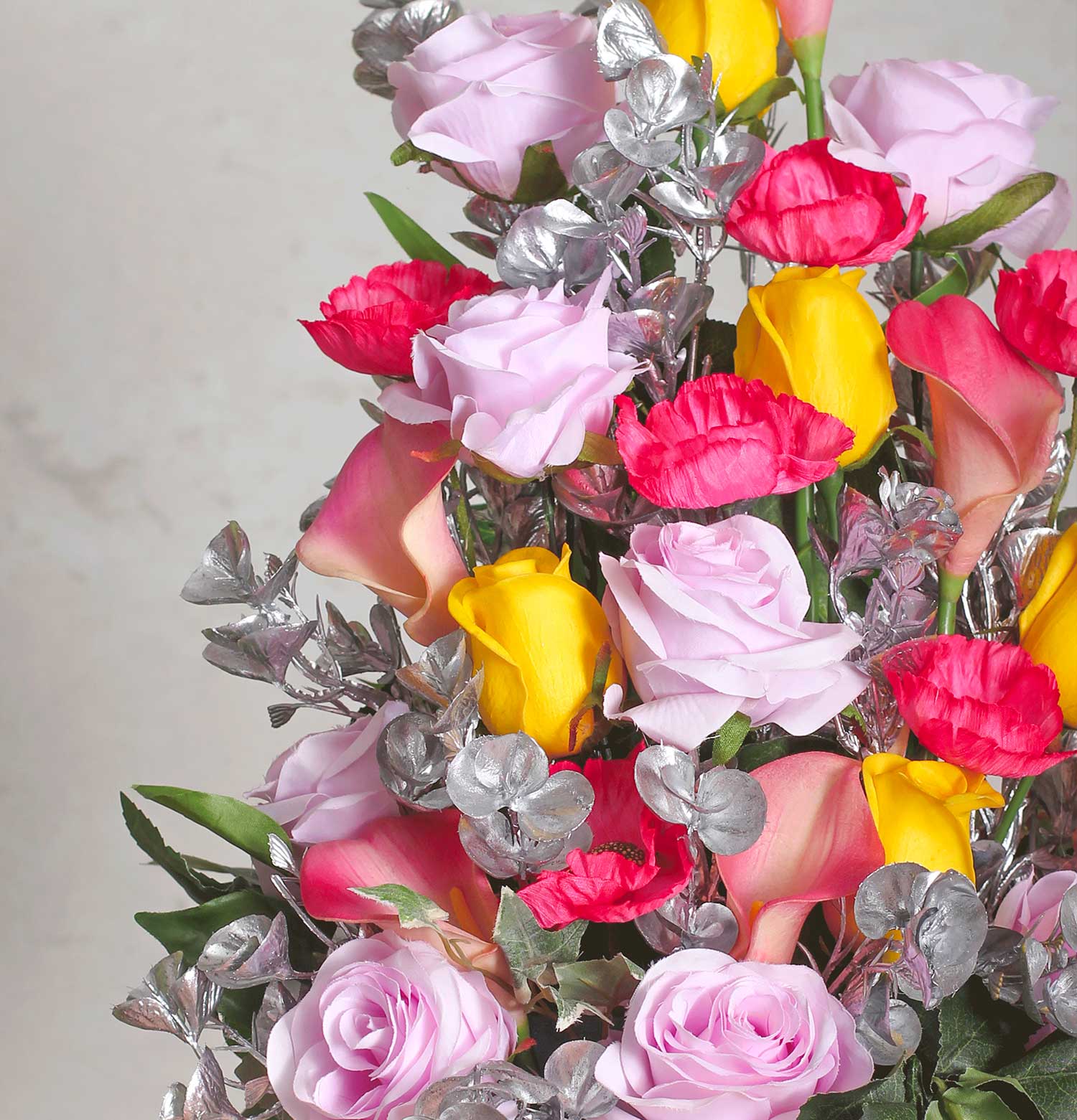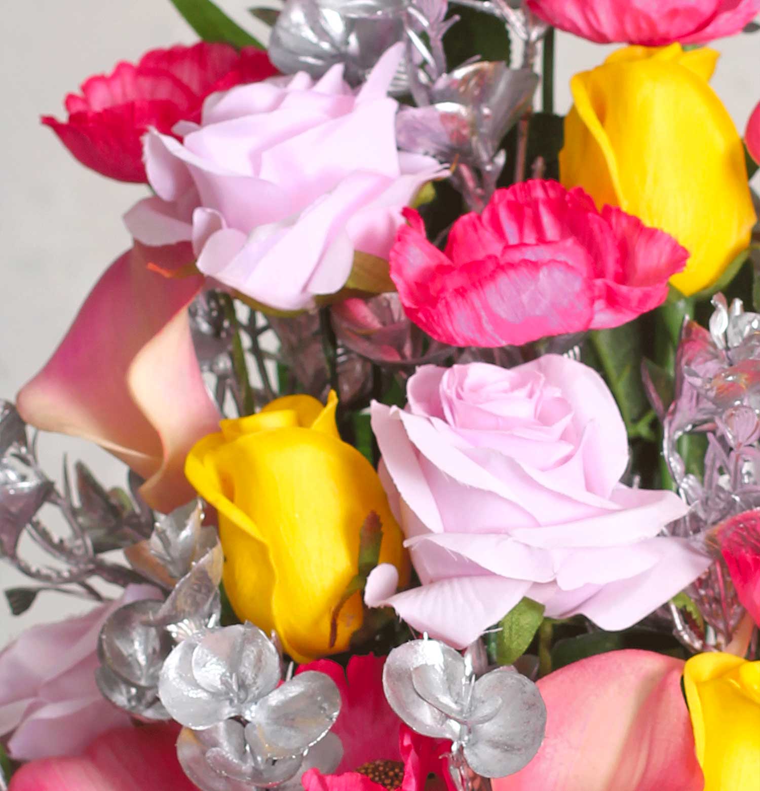 This luxurious ensemble features a handpicked selection of silk roses in jubilant hues of pink, yellow, and red, nestled among lush silver-green foliage. The arrangement is artfully presented in a vintage-inspired white vase, gracefully embellished with a pink ribbon motif, making it a timeless statement piece for sophisticated events and refined home decor.
