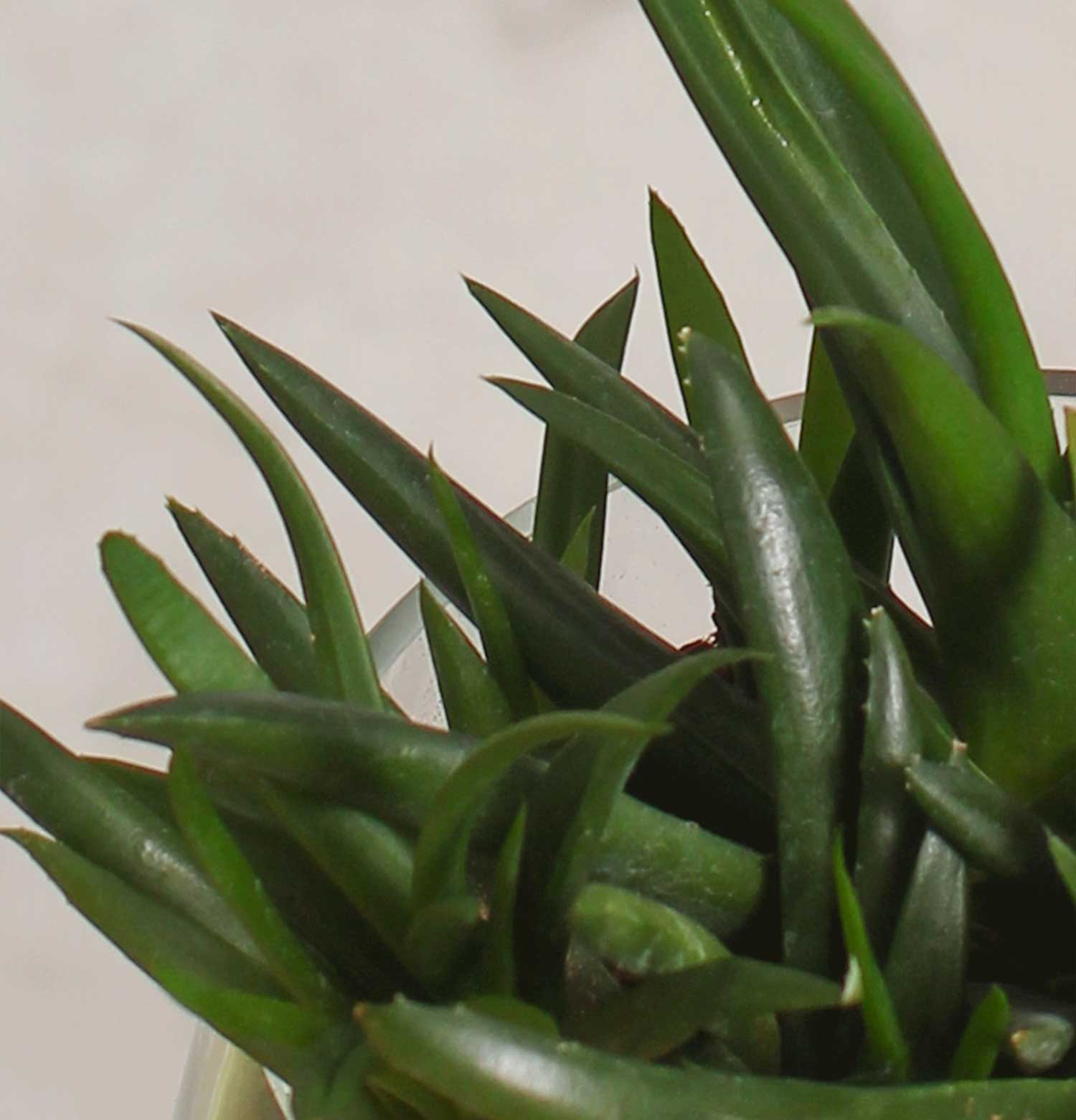 "Miniature Succulent"This charming miniature succulent, nestled in a sleek glass container, offers a touch of greenery to any space. Its low maintenance and enduring form make it an ideal adornment for modern desks or as a thoughtful gift for plant lovers.