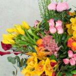 The “Pop And Petals Flower Basket” is a lively celebration of color, brimming with bright yellow, pink, and red flowers, complemented by a variety of textures and greens in a traditional wicker basket. It’s a joyful expression for any cheerful occasion.