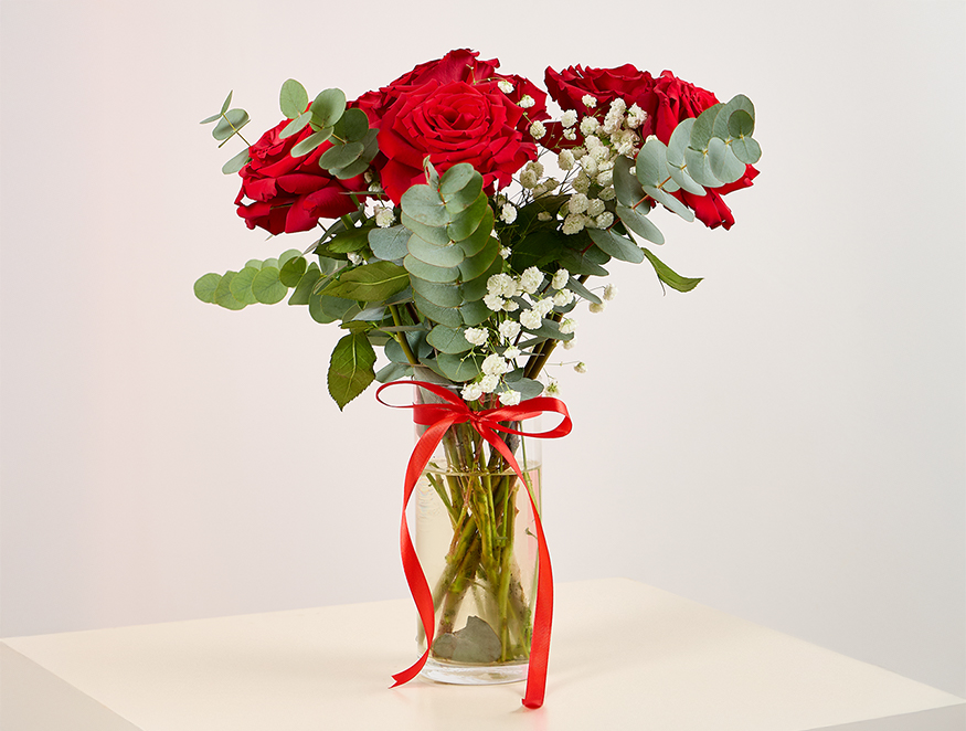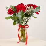 Pure Affection showcases radiant red roses, baby’s breath, and eucalyptus, elegantly symbolizing passion and tenderness in a reusable vase.