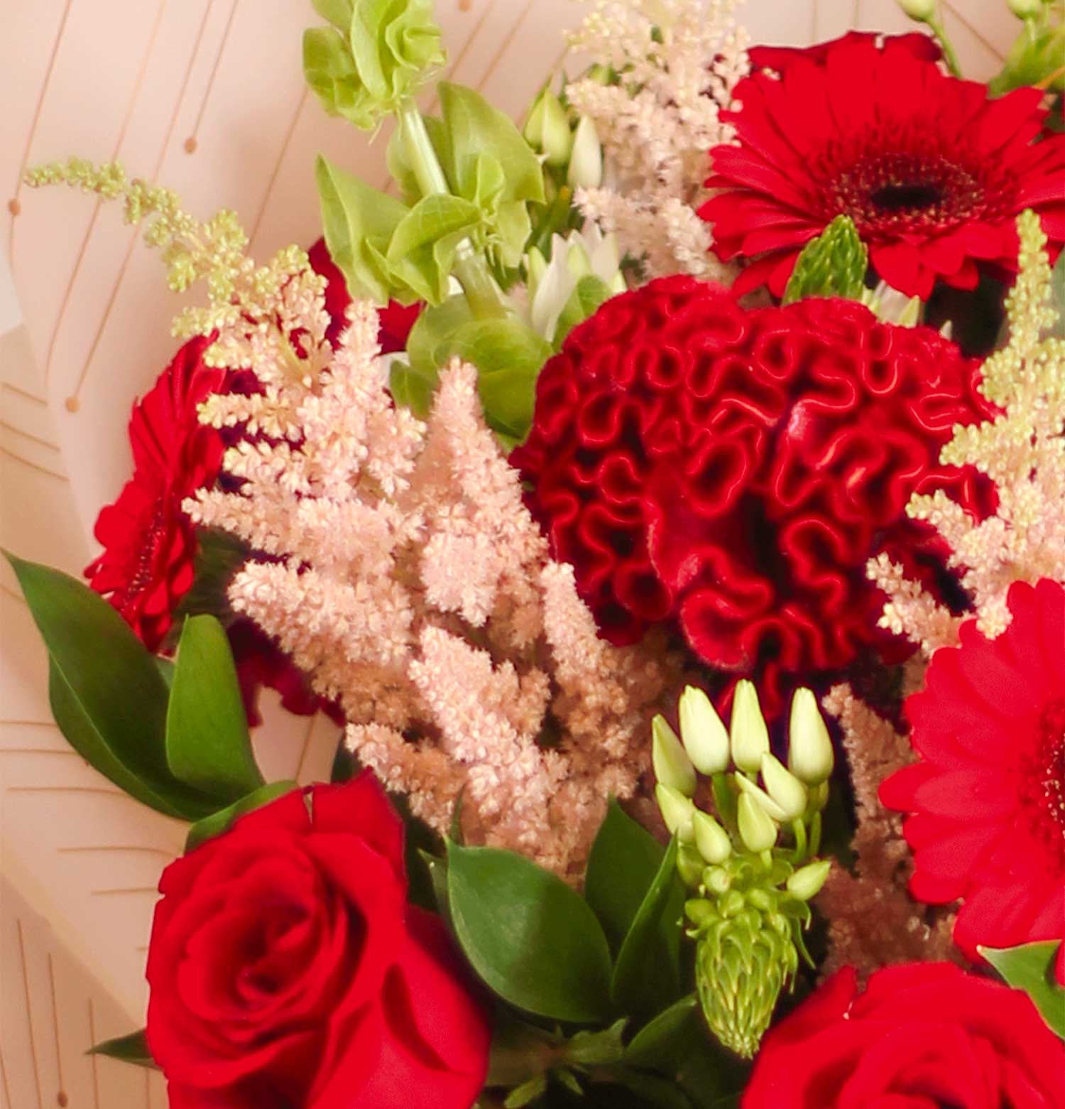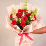 “Rock N Roll Flower Bouquet” brings a vibrant energy with its mix of red flowers and lush greenery, all tied up in a natural paper wrap with a red ribbon. This bouquet is a bold statement piece that’s sure to bring rhythm and life to any occasion.