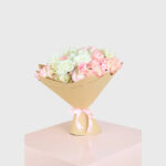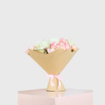 The Rosy Embrace bouquet features soft white roses and delicate blush pink blooms. Perfect for expressing love or brightening someone’s day.