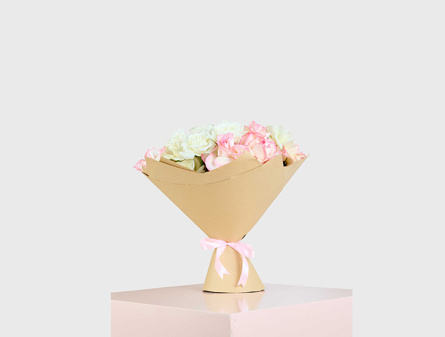 Wrap yourself or a loved one in the tender beauty of this stunning arrangement. Featuring soft white roses intertwined with delicate blush pink blooms, the Rosy Embrace bouquet exudes warmth, romance, and elegance. Perfect for expressing love, celebrating special moments, or simply brightening someone's day, this arrangement is tied together with a charming pink ribbon, making it a gift that feels as sweet as a heartfelt hug. Let the soft hues and lush petals of Rosy Embrace speak the language of love and joy.