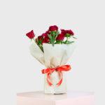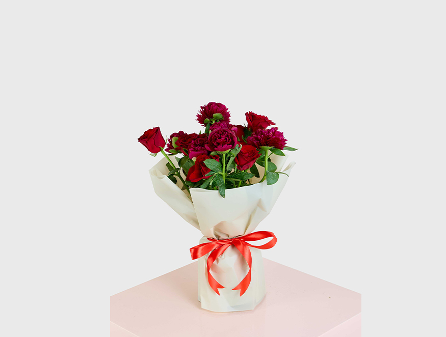 Bold and beautiful, this striking bouquet features deep red roses and rich crimson blooms wrapped in elegant white paper, finished with a luxurious red satin ribbon. The perfect symbol of love, passion, and admiration, it’s an ideal gift for anniversaries, romantic gestures, or to simply make a grand statement. A stunning display of affection that speaks volumes without saying a word. Gift Details: Roses Peony