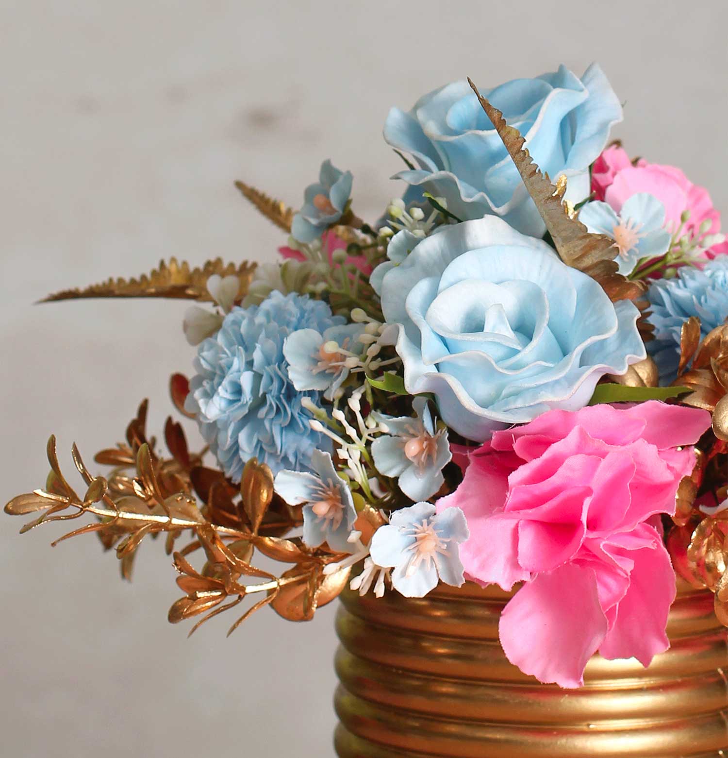 The "Short and Sweet Artificial Flower Arrangement" offers a touch of minimalist elegance with its pastel blooms and gold-toned vase. This tastefully understated piece combines the softness of pink and blue flowers with the warm glint of gold, perfect for adding a serene yet luxurious accent to intimate gatherings or chic interior spaces.