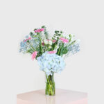 and soft blue Hydrangeas. Wrapped in chic pastel paper, this arrangement evokes feelings of warmth and tenderness, making it the perfect gift for special occasions such as weddings, baby showers, or when you simply want to show someone they’re loved. A timeless and sophisticated choice for any occasion.