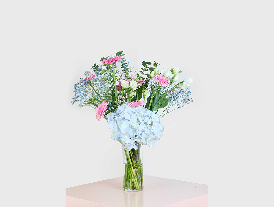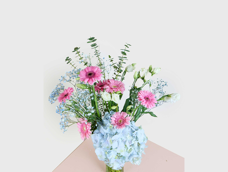 Embrace the softness of pastel tones with this dreamy bouquet, featuring delicate pink Gerberas, creamy white Roses, Lisianthus, and soft blue Hydrangeas. Wrapped in chic pastel paper, it’s a timeless and sophisticated choice for special occasions or simply to show someone they’re loved.