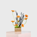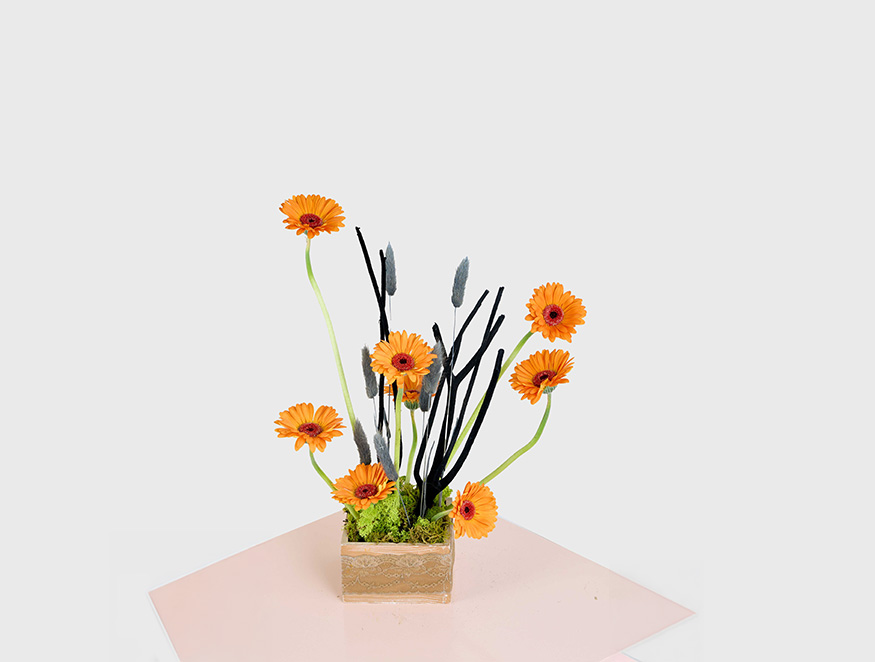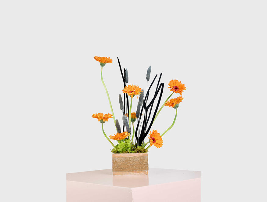 Brighten any space with this joyful arrangement of vibrant orange gerbera daisies, radiating warmth and energy. Paired with sleek black decorative accents and dried bunny tail, this striking contrast adds a bold, modern flair to the arrangement. Set in a rustic, lace-adorned box, this playful yet elegant design is perfect for lifting spirits, whether as a gift or a delightful décor piece for any occasion.