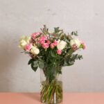 This refined vase arrangement, named ‘The Dutchess’, is a composition of understated elegance, featuring blushing pink roses amidst a backdrop of fresh greens. It embodies a regal charm and sophistication suitable for gracing homes or celebrating life’s genteel moments.