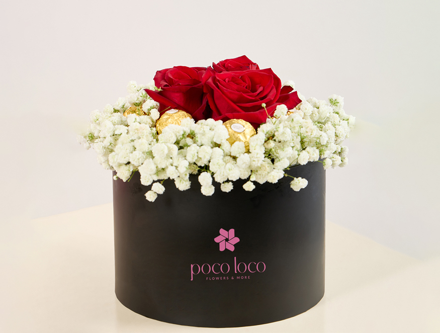 The Timeless Grace bloom box combines vibrant roses and delicate baby’s breath in a sleek black box, exuding love, purity, and sophistication.