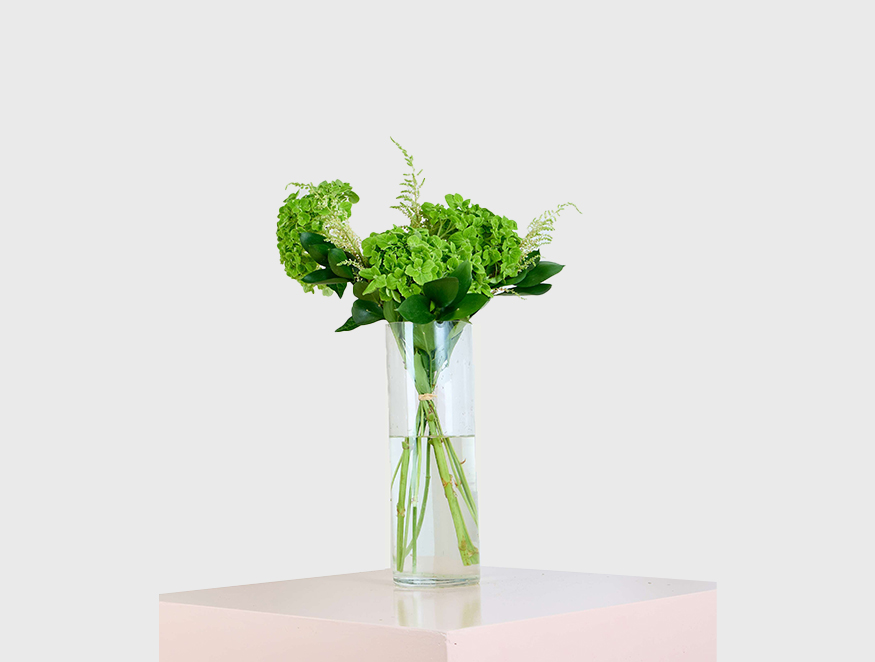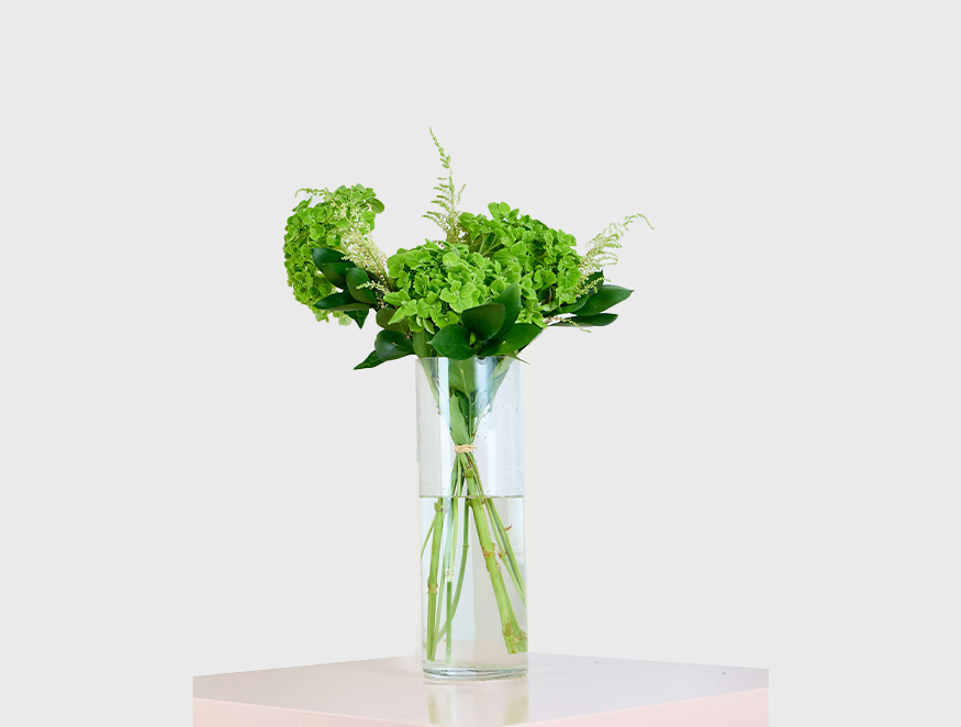 Verdant Harmony is a refreshing display of nature’s elegance. Lush green Hydrangeas are paired with the feathery beauty of Astilbe, while delicate sprigs of Ruscus add a touch of organic grace. Arranged in a sleek, tall clear cylindrical vase, this composition brings the freshness of the outdoors into any space. The combination of textures and shades of green creates a soothing yet sophisticated look, making Verdant Harmony a perfect choice for those who appreciate nature’s quiet charm and elegance. This arrangement effortlessly complements modern and classic decor alike.
