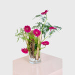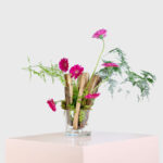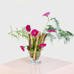 Wild Charm features vibrant fuchsia gerbera daisies and lush greenery arranged in a clear glass vase with white pebbles. This artistic flower arrangement captures nature’s beauty, making it a unique gift for those who appreciate creativity. Great for corporate gifting.