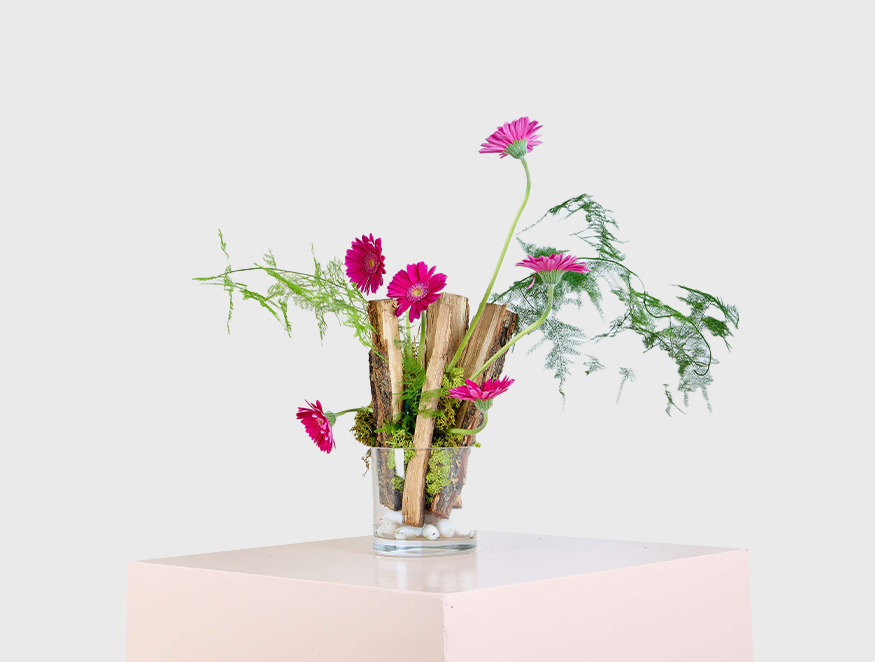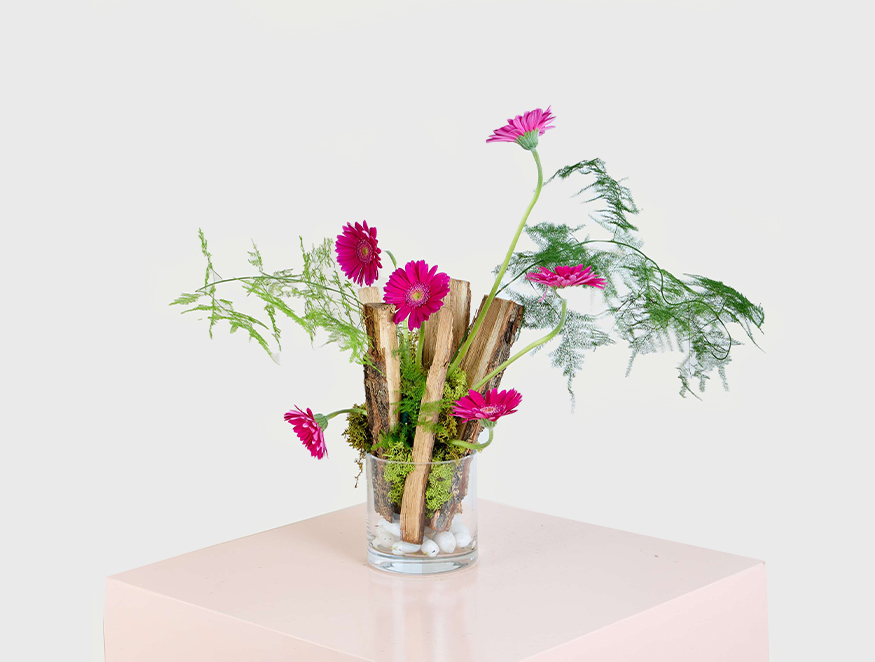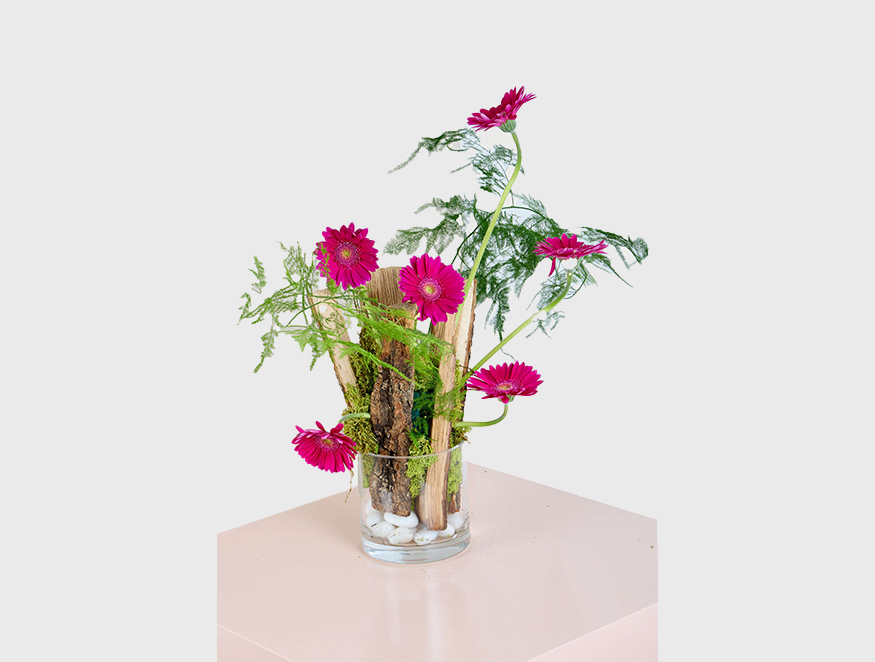 Wild Charm is a bold and artistic flower arrangement that brings a touch of nature’s raw beauty indoors. Featuring vibrant fuchsia gerbera daisies nestled among moss-covered bark and lush greenery, this piece is a striking combination of modern design and organic elements. The asymmetrical arrangement, placed in a clear glass vase with smooth white pebbles, evokes the untamed essence of a woodland garden. Perfect as a unique statement piece or a thoughtful gift for those who appreciate nature's wild beauty, Wild Charm is an unforgettable expression of creativity and style.